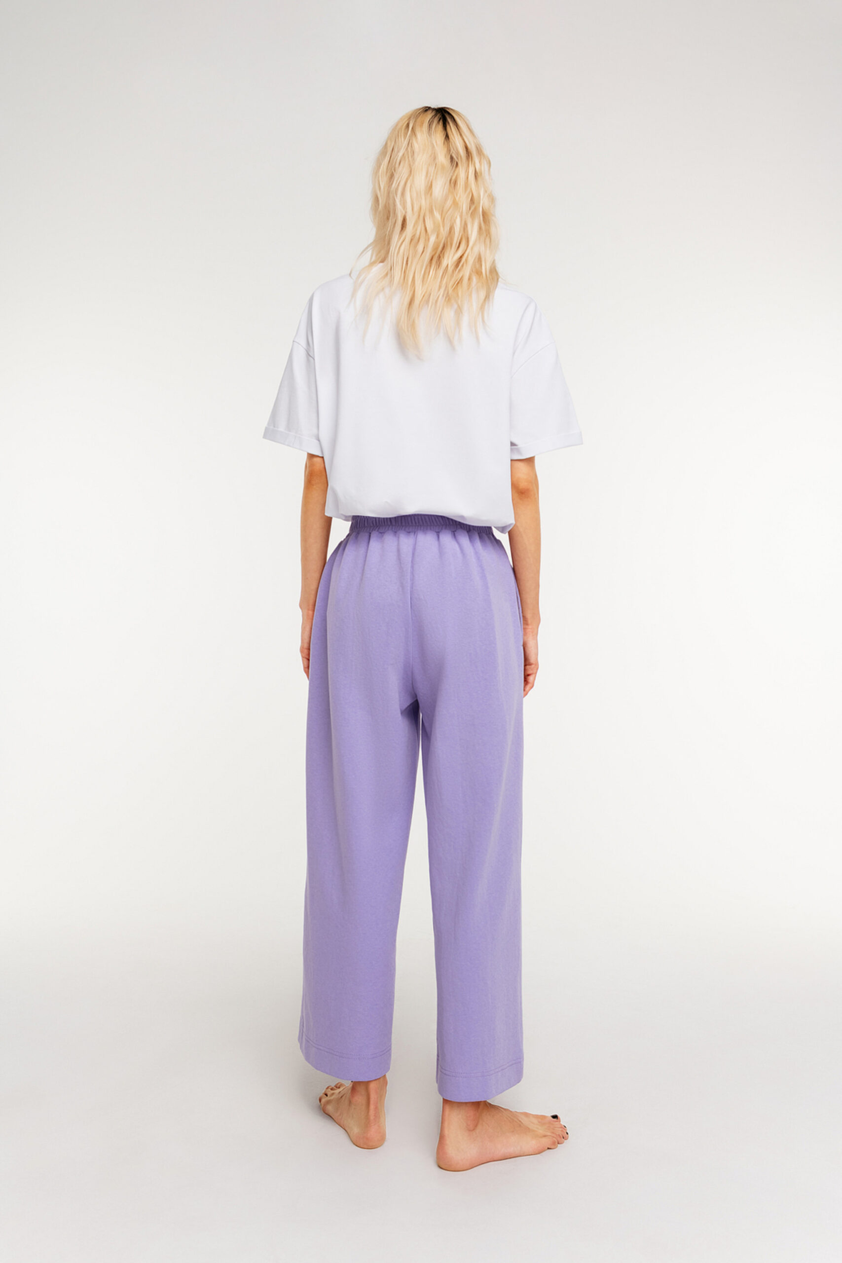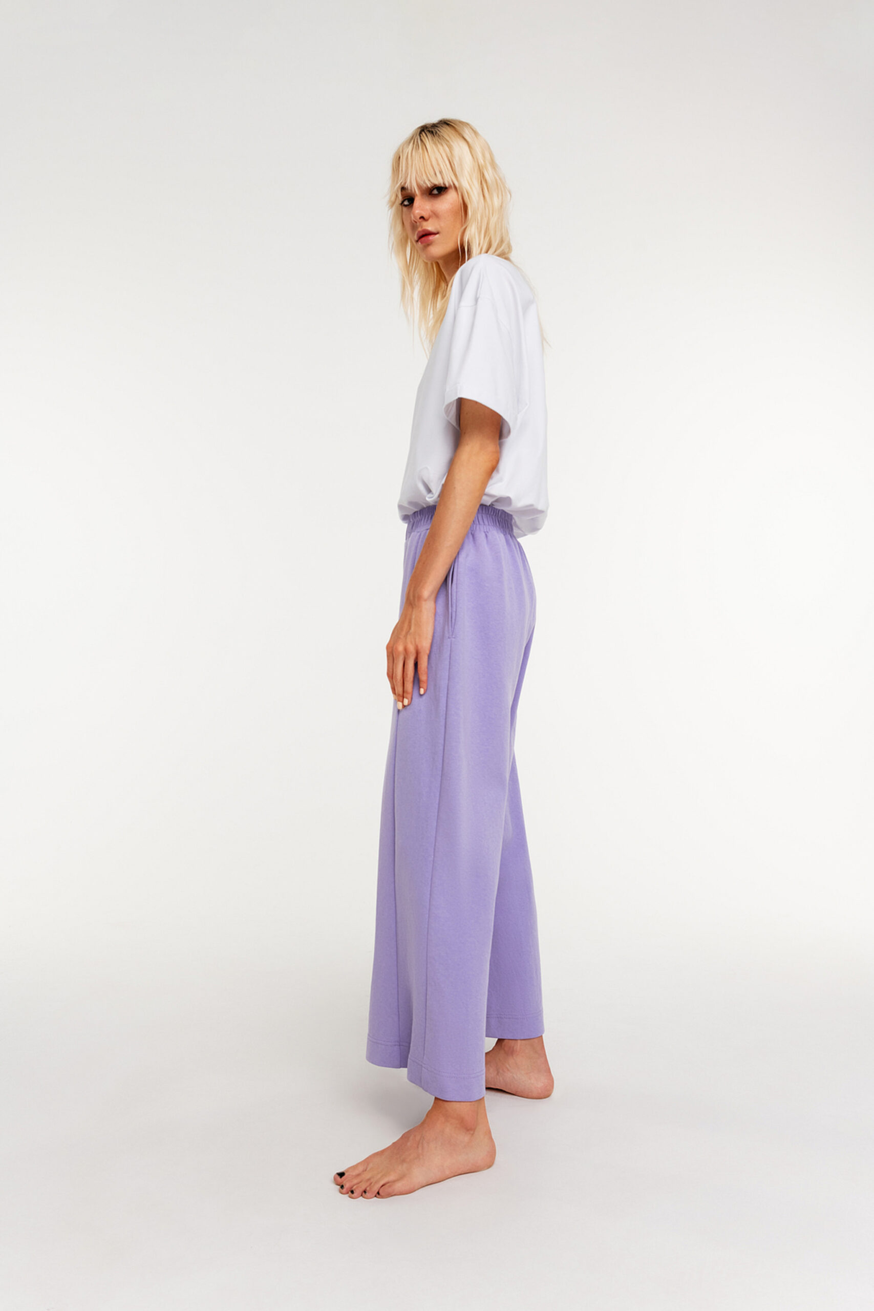 Широкие укороченные брюки с эластичным поясом. Выполнены из плотного хлопкового трикотажа.