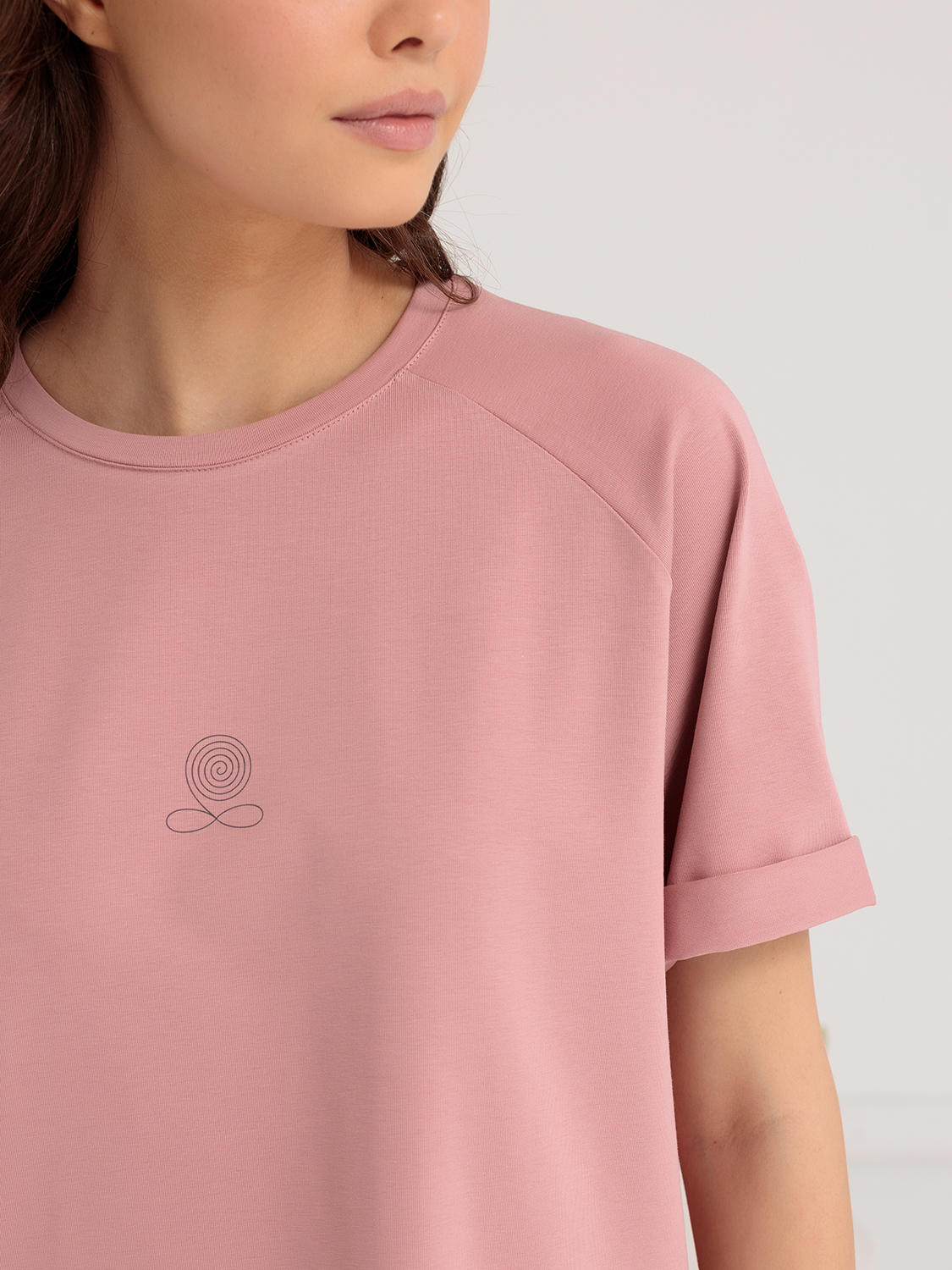По центу футболки нанесён символ «Женственность». Символ проявляет женские потоки. Помогает выйти в ресурсное состояние, которое позволяет женщине стать более тонкой, легкой, свободной.