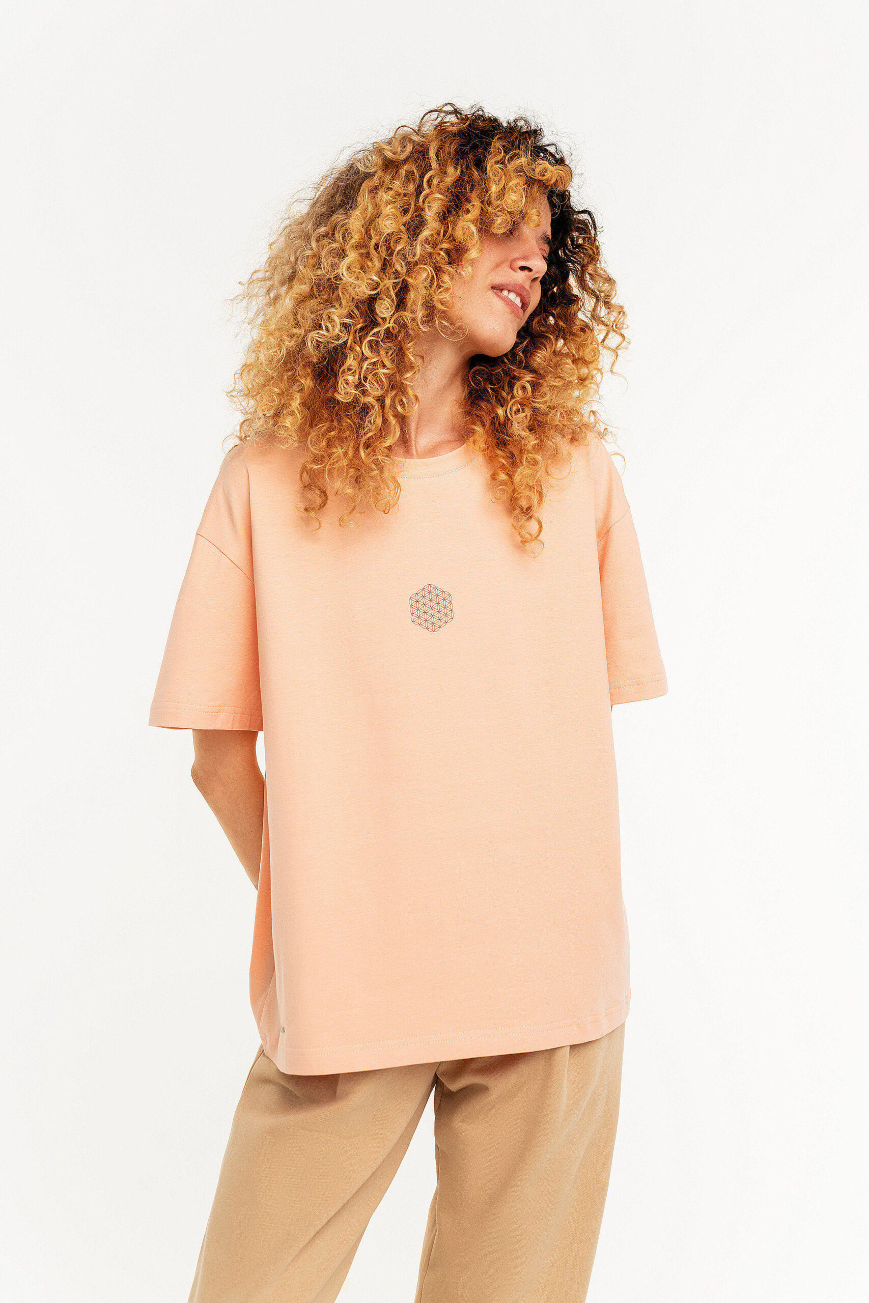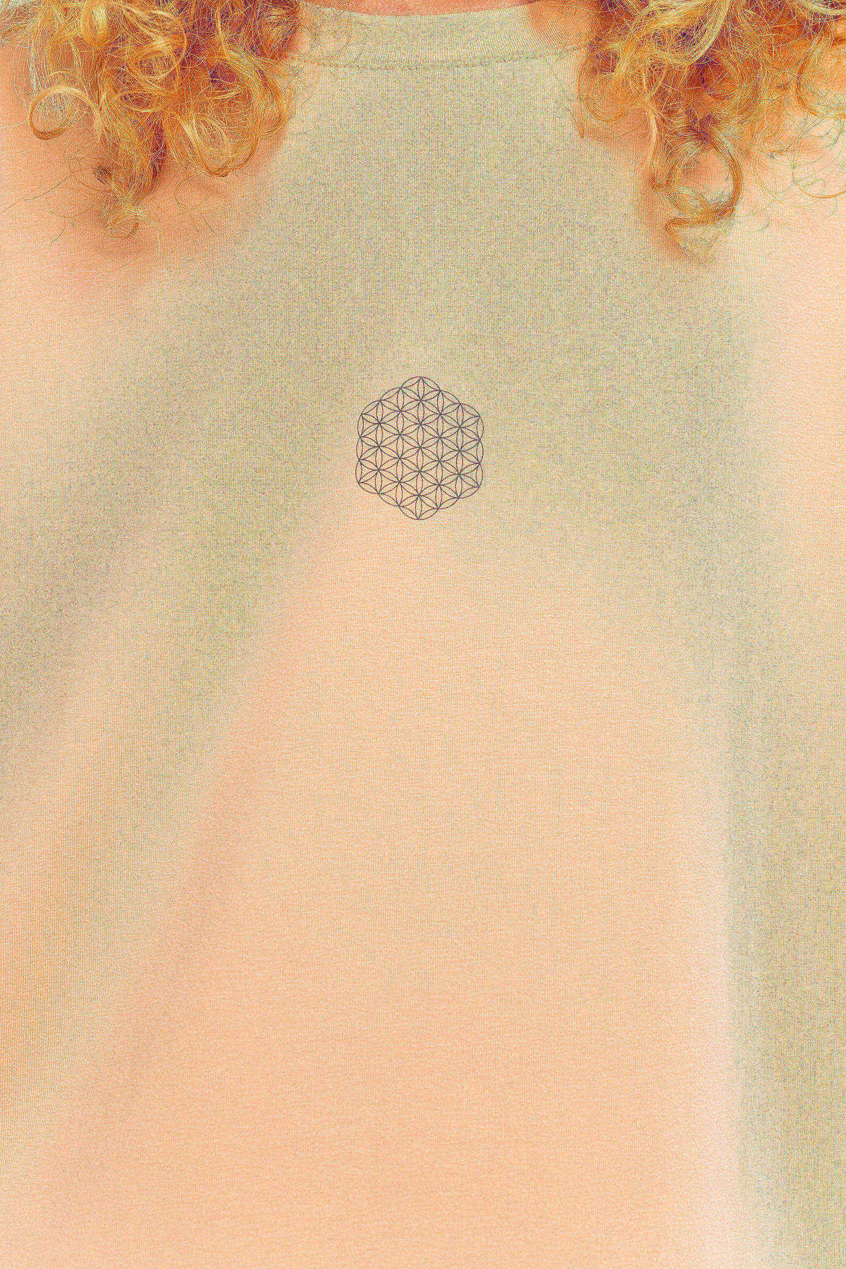 На футболке нанесен символ сакральной геометрии "Цветок жизни" и логотип HAMILIYA.