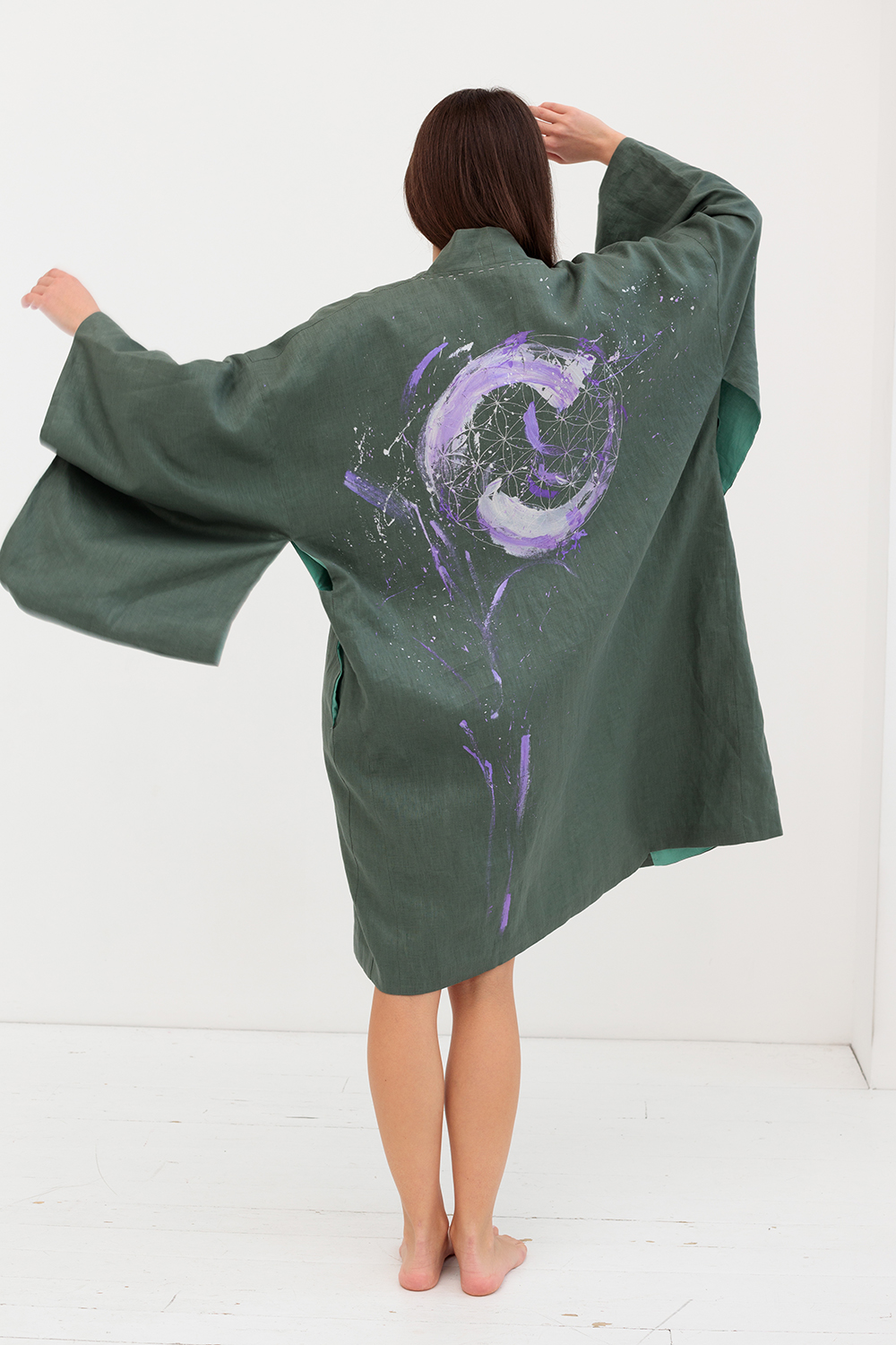 Совокупность расслабленной посадки и натуральности ткани делает кимоно Айсана особо привлекательным для летнего отдыха, медитаций и для домашнего использования.
