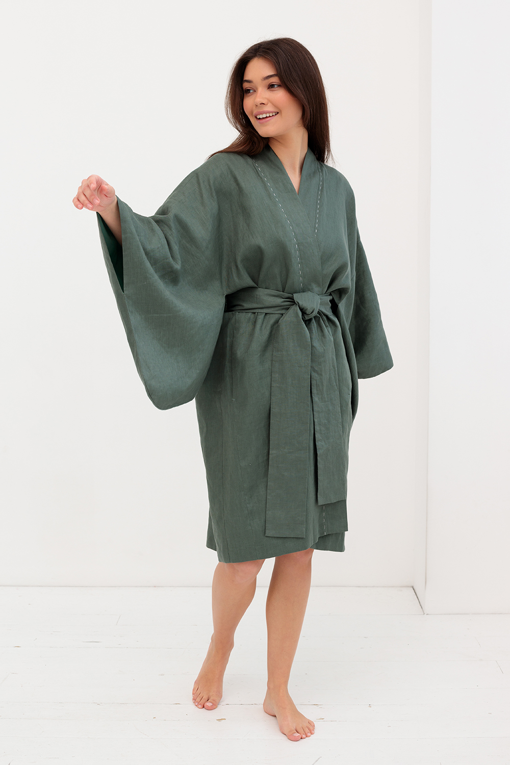 Кимоно выполнено из льна. Это полностью натуральный материал, который отлично дышит, согревает и впитывает влагу. Для большего комфорта при использовании внутри изделия имеется подкладка.