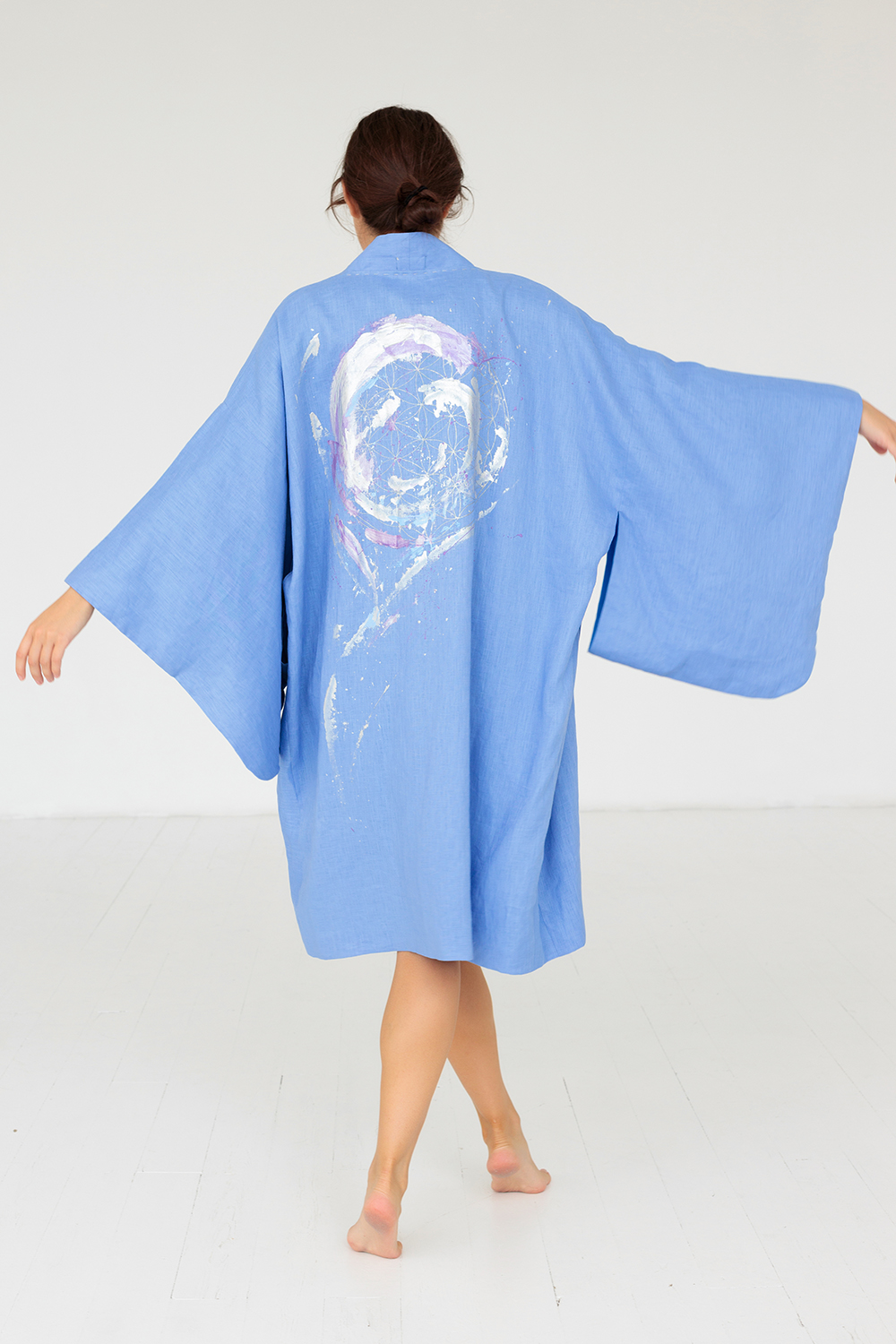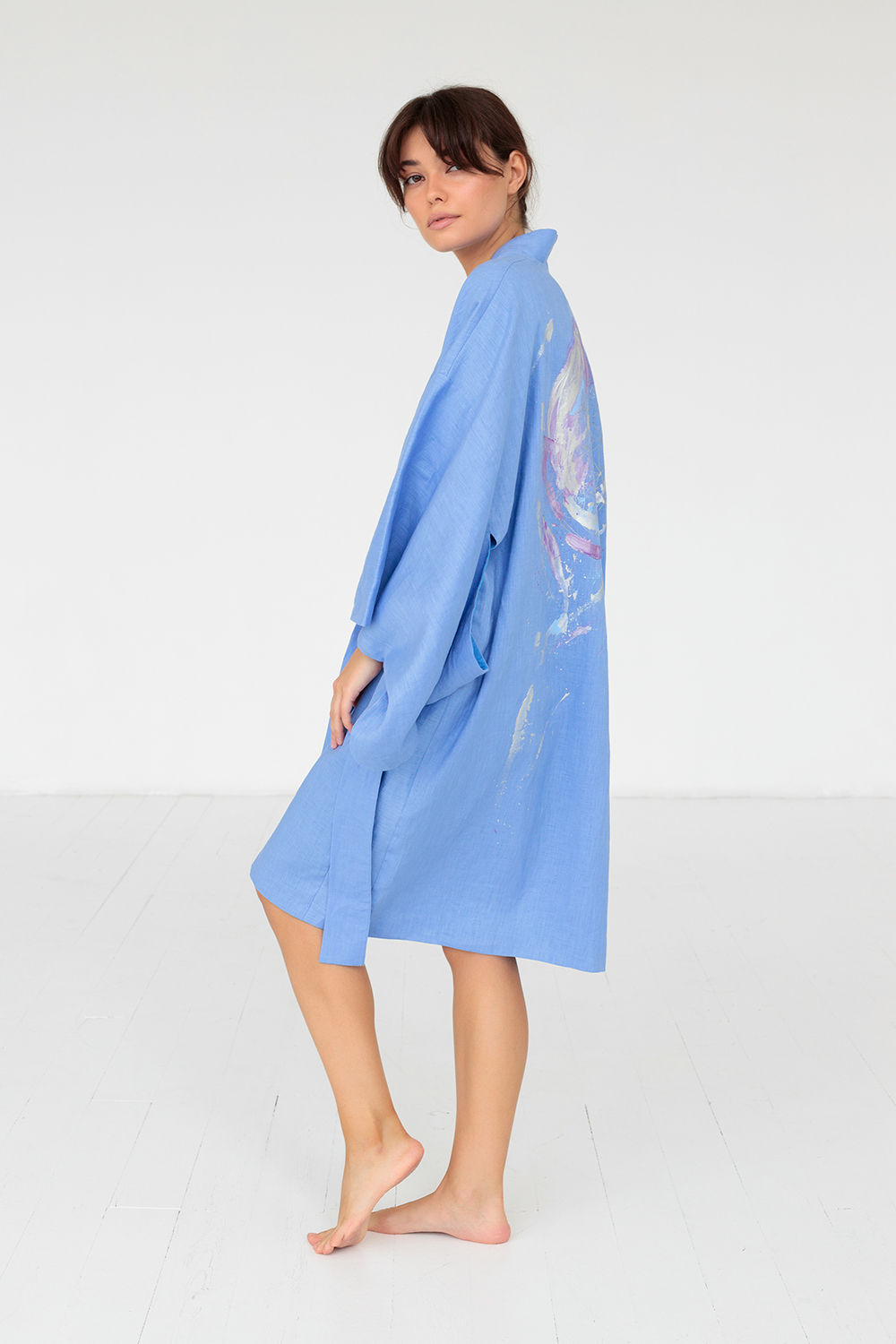 Совокупность расслабленной посадки и натуральности ткани делает кимоно Айсана особо привлекательным для летнего отдыха, медитаций и для домашнего использования.