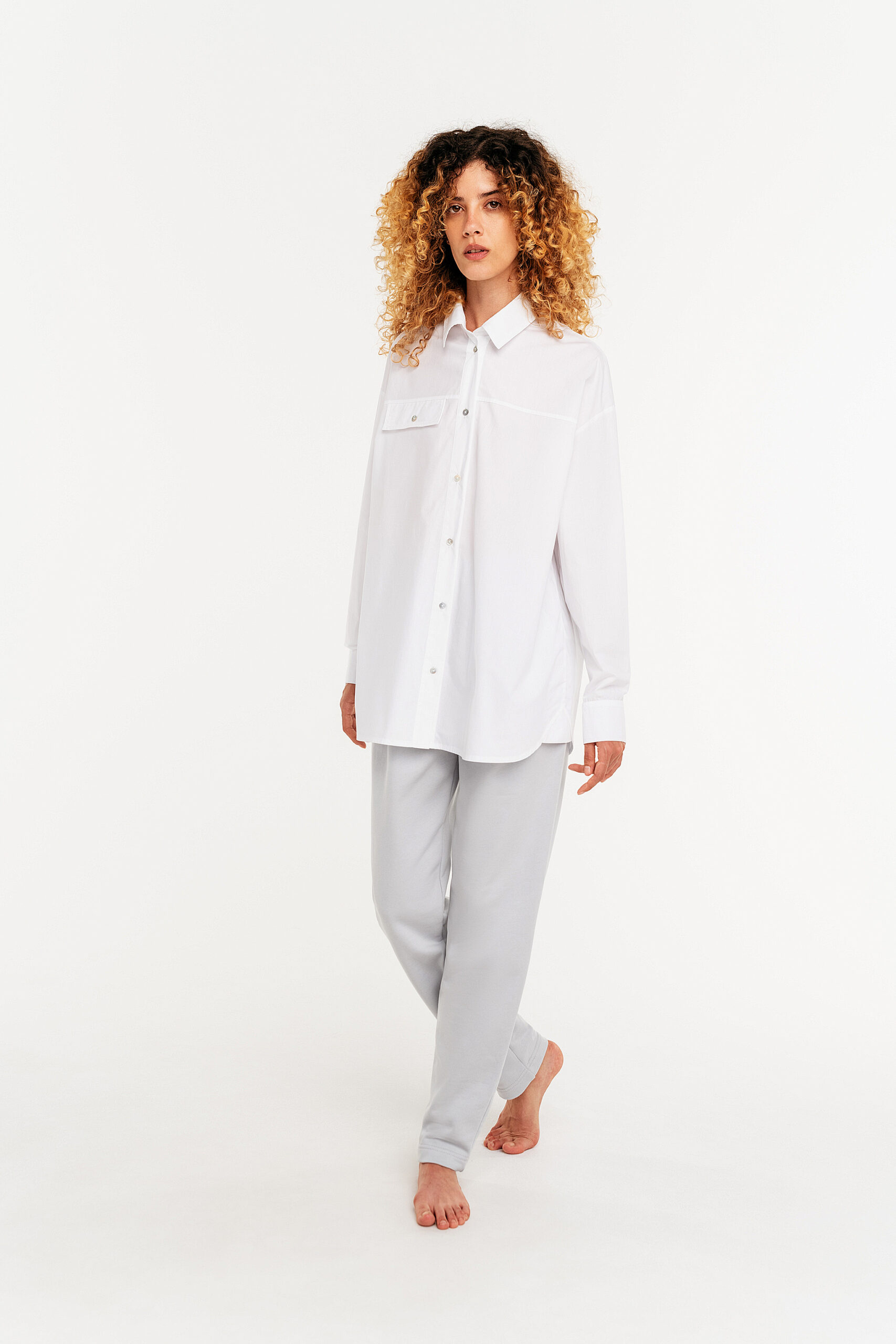 Льняная рубашка свободного кроя.