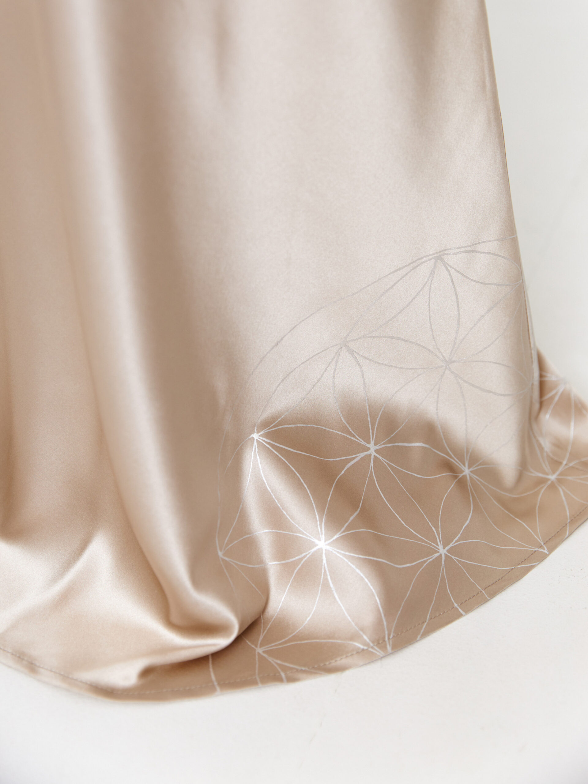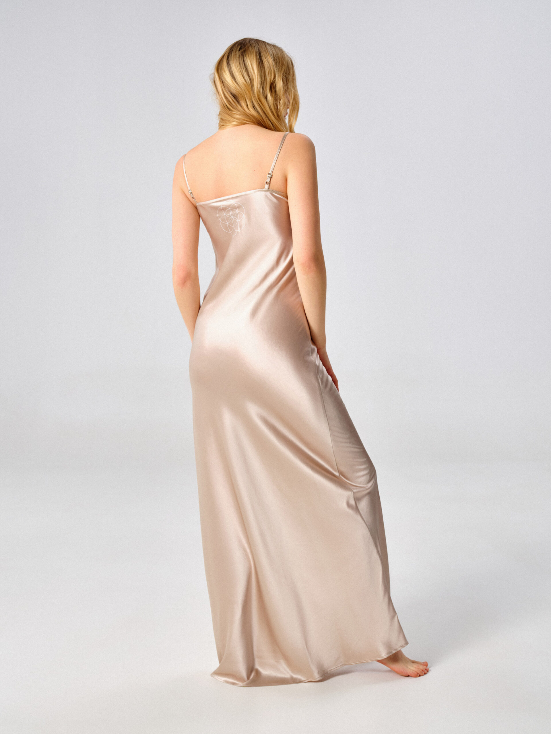 Для платья выбран натуральный шёлк, который струится по телу и переливается при любом освещении.