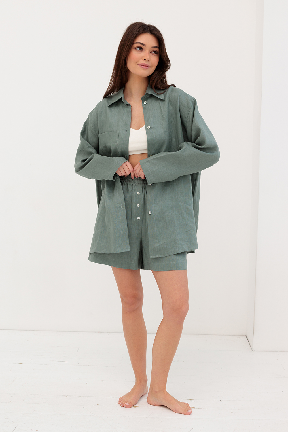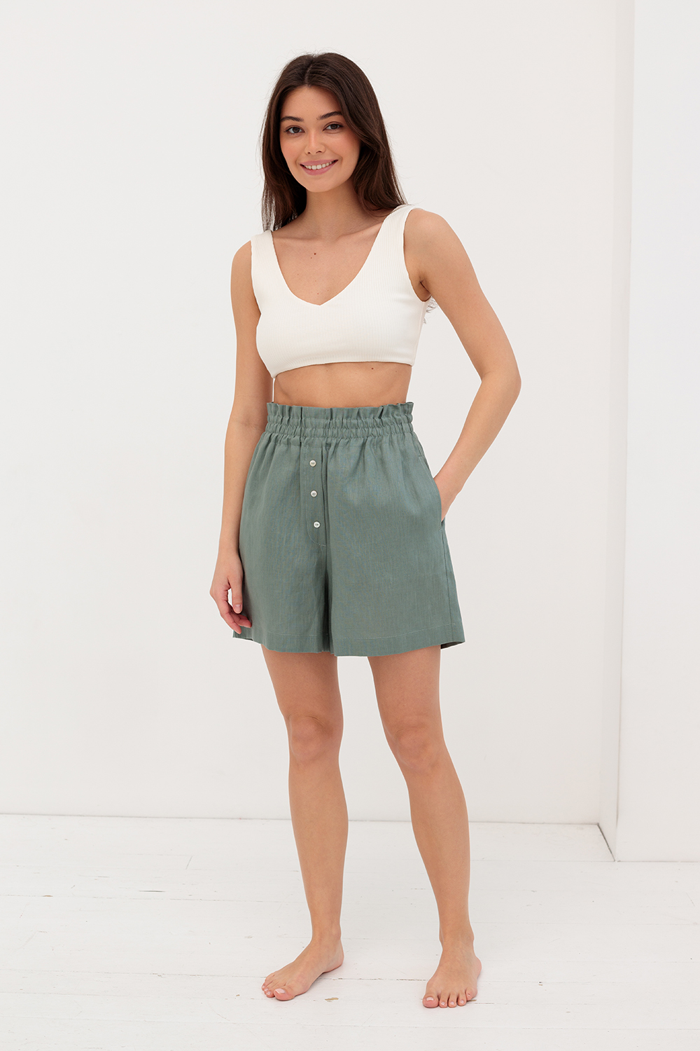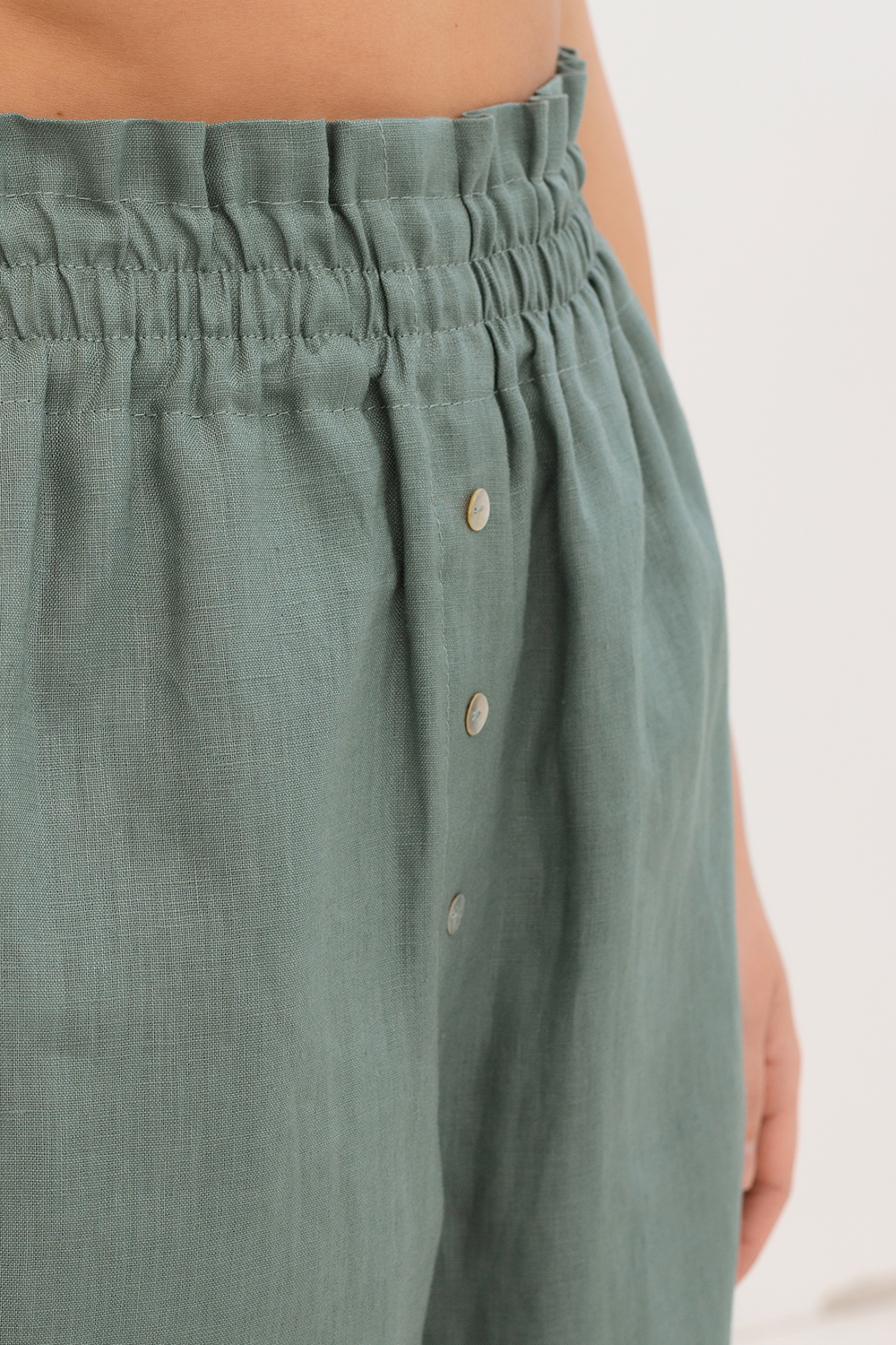 Льняные шорты с поясом на резинке и пуговицами, свободного кроя.