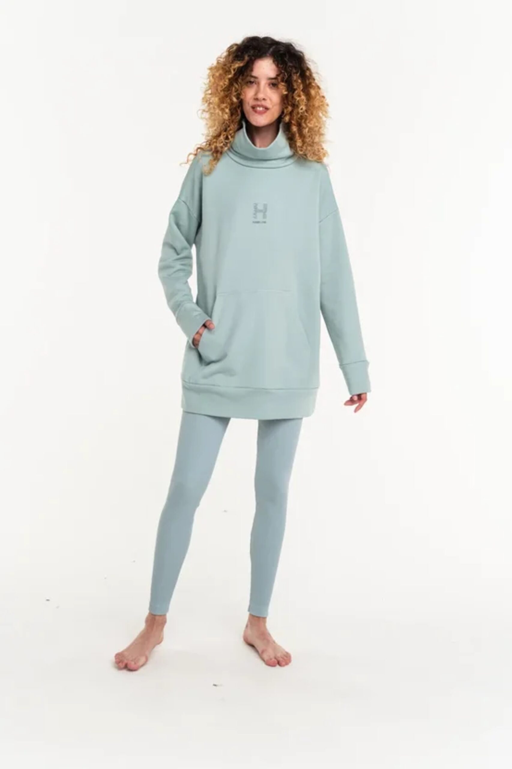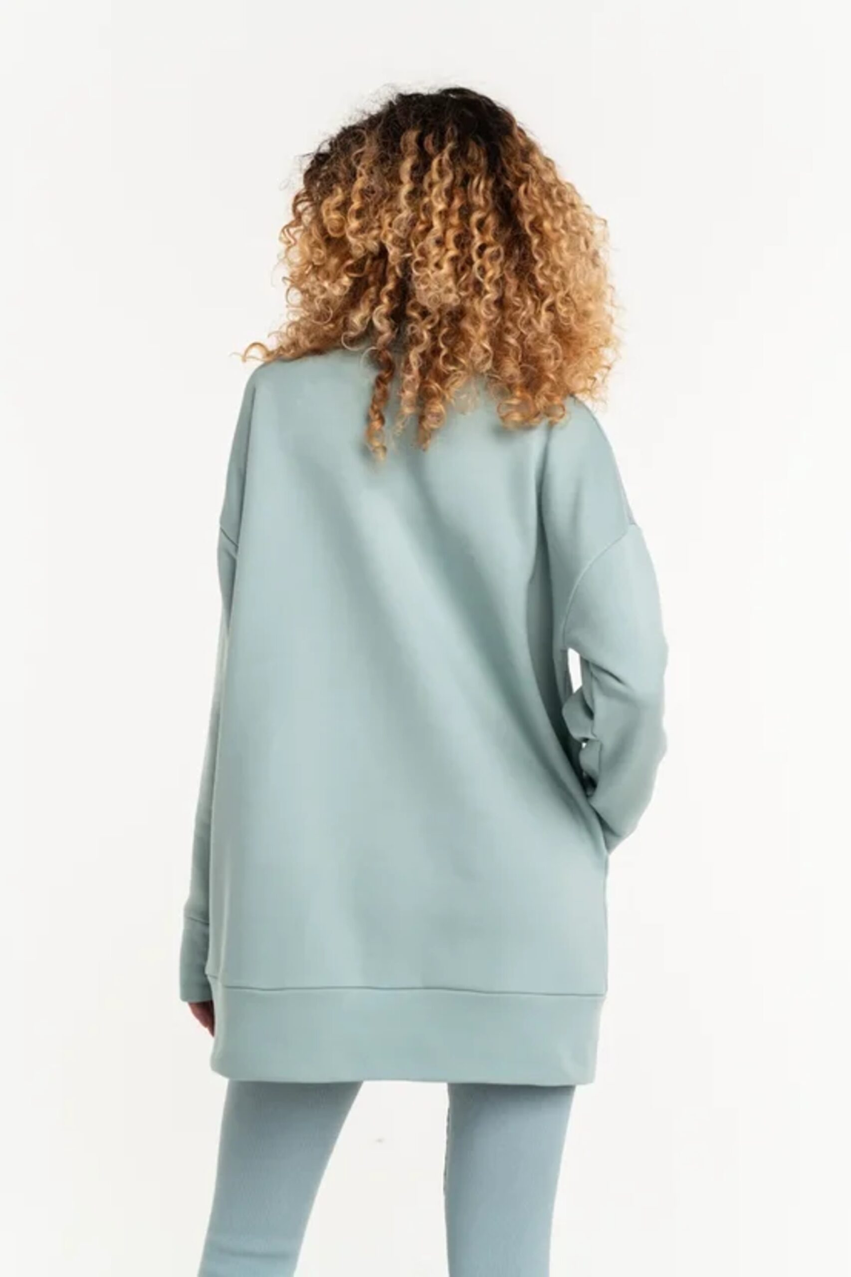 Свитшот удлиненного прямого кроя с высоким воротом.