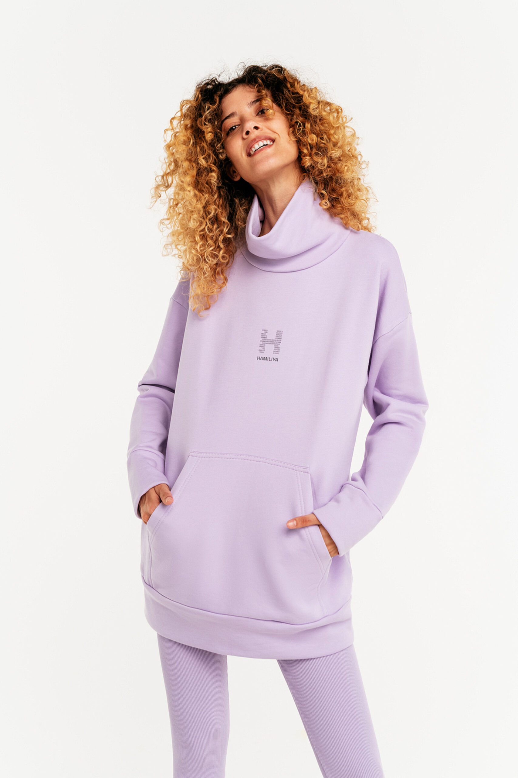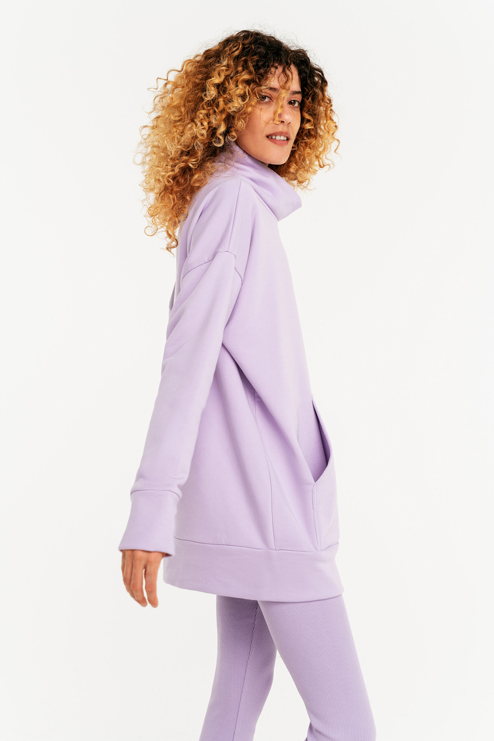 Свитшот удлиненного прямого кроя с высоким воротом.