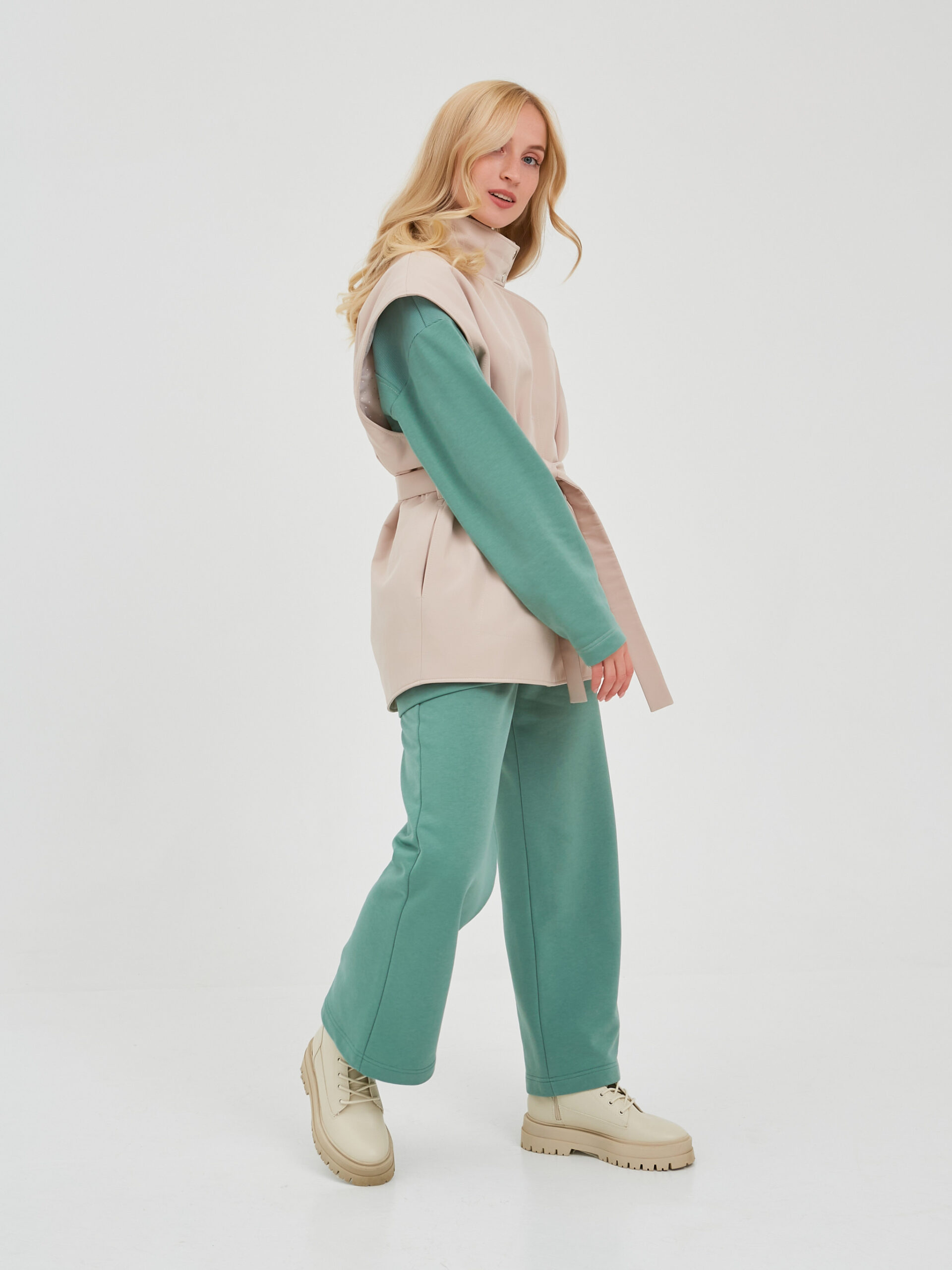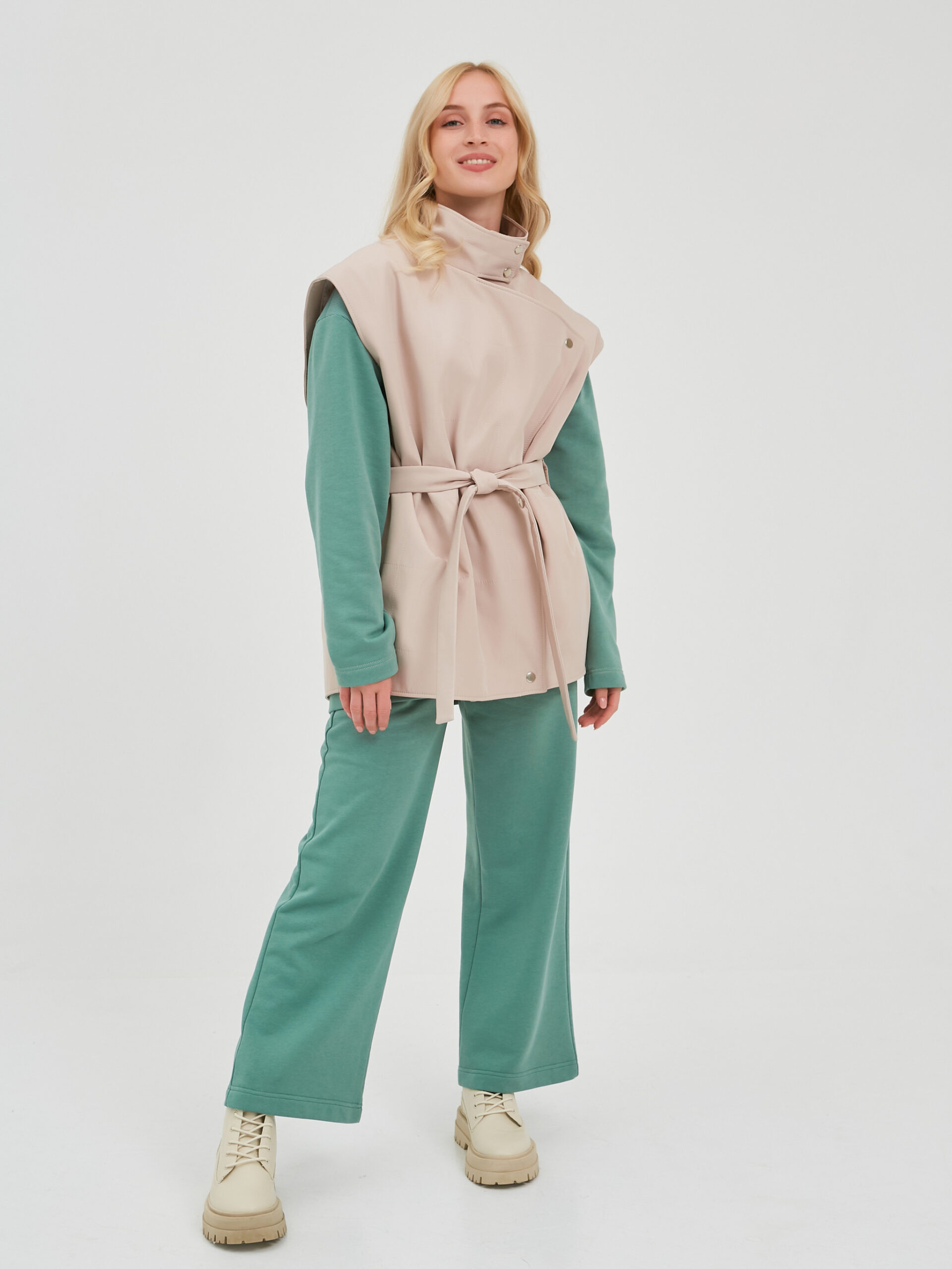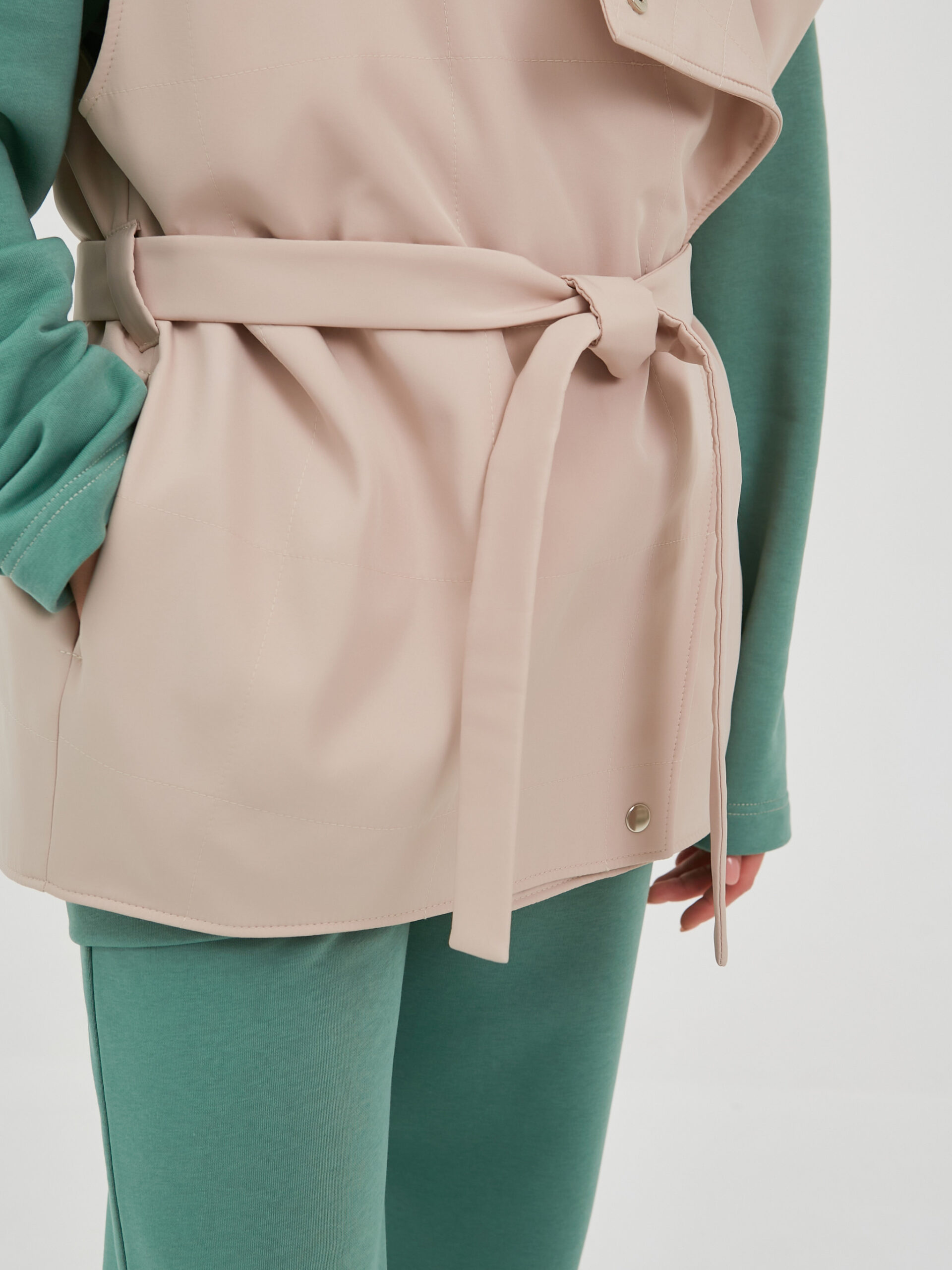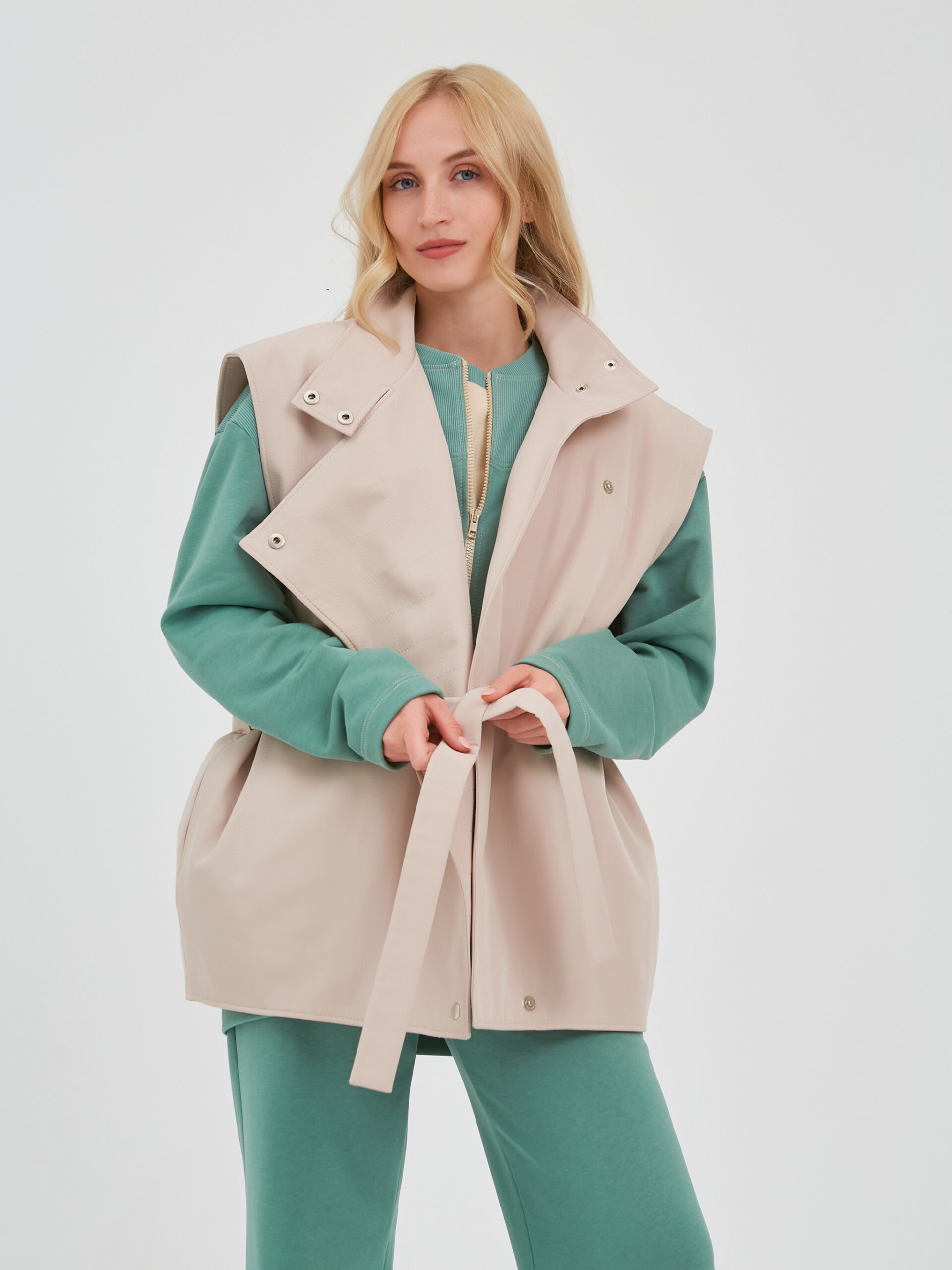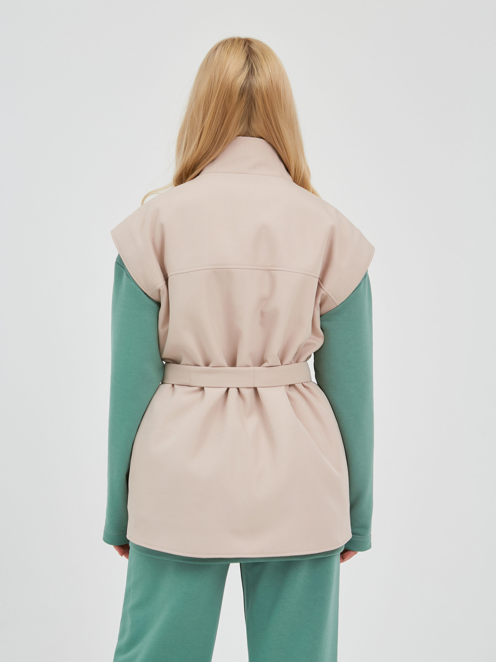 Жилет с широкими лацканами выполнен из ткани бежевого цвета.